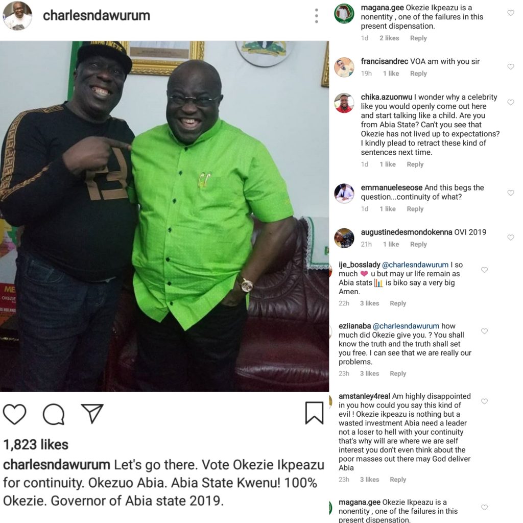 Nollywood Actor, Charles Awurum took to his Instagram page to campaign for Governor, Okezie Ikpeazu of Abia State.