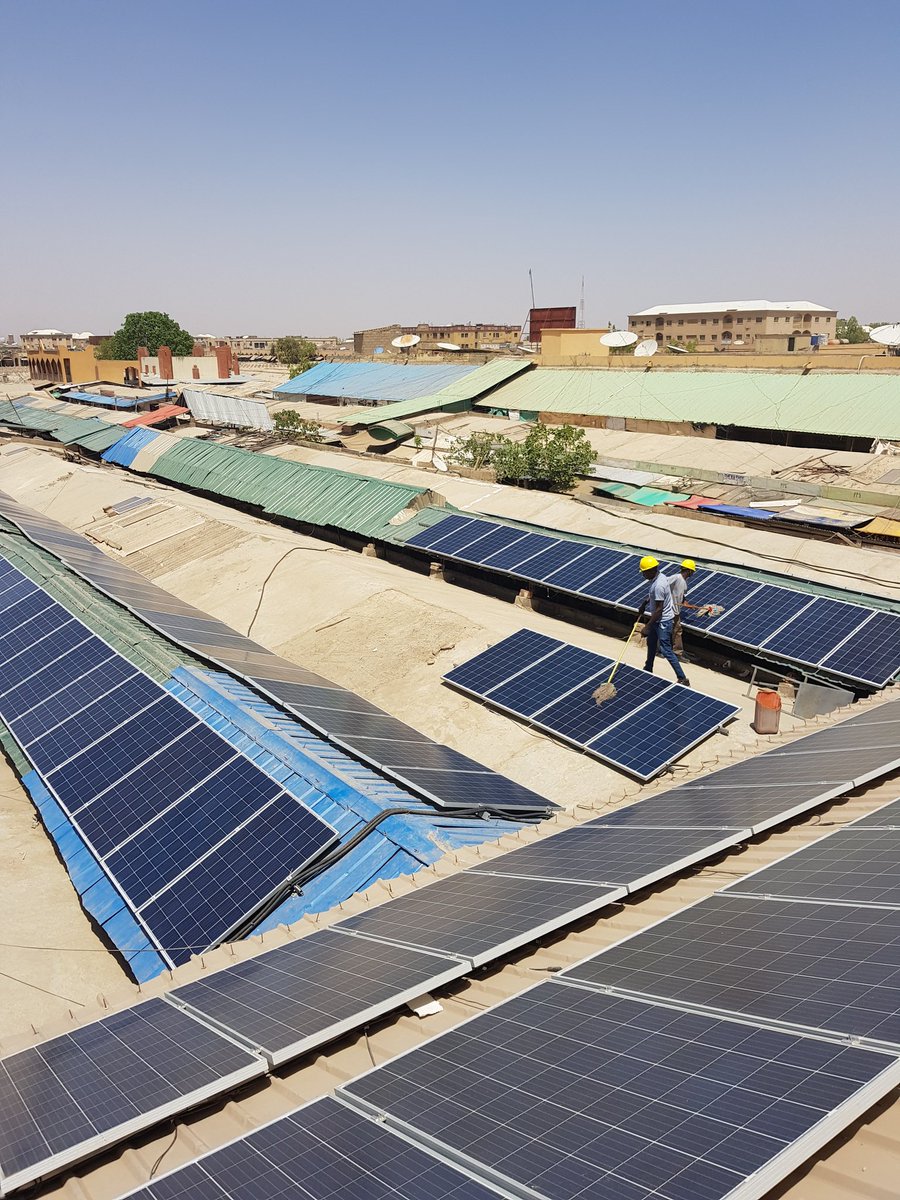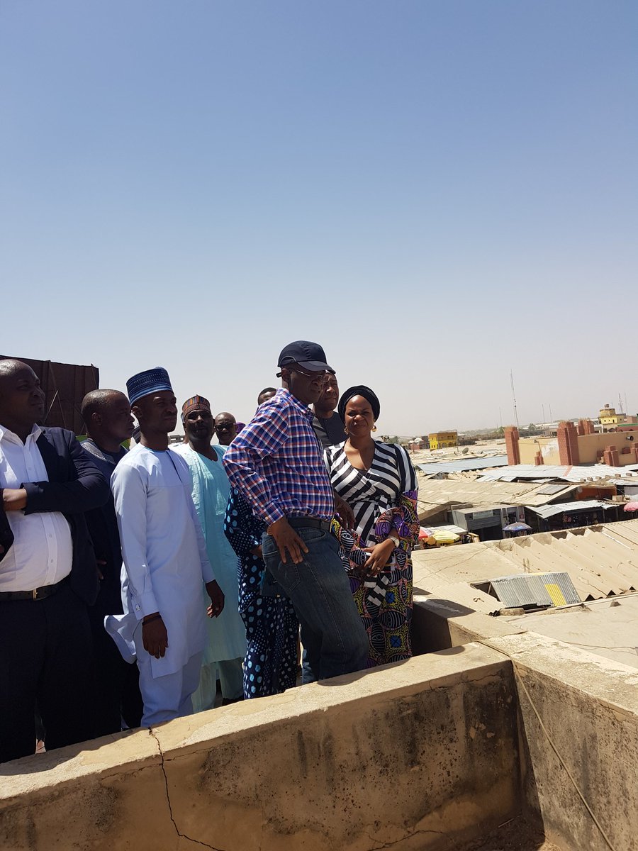 Honourable Minister Of Power, Works and Housing, Babatunde Raji Fashola and the his team Inspect the Solar Panels of the Electrified Shops Project on the Roofs at Sabon Gari Market, Kano.