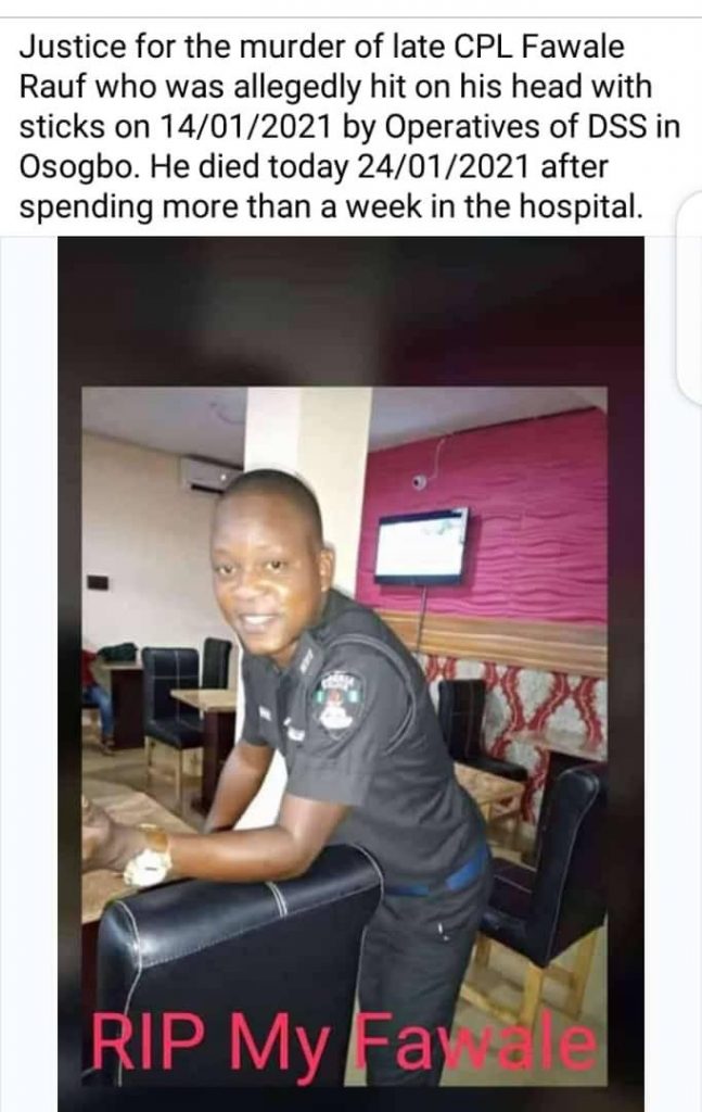 In Osogbo, DSS officers alleged for beaten a police officer identified as Corporal FAWALE RAUF of Dada Estate Police Station, Osogbo to coma last week and the victim has gave up today.