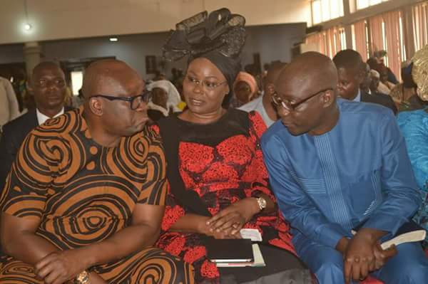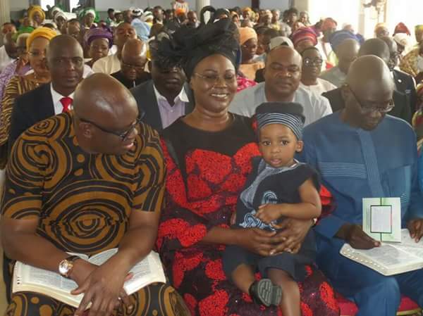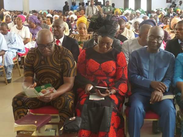 Ekiti state Governor Fayose today held a thanksgiving service at Lady Jibowu Hall of the government house in celebration of his 57th birthday.He was pictured giving his wife a hug at the event. See photos after the cut….