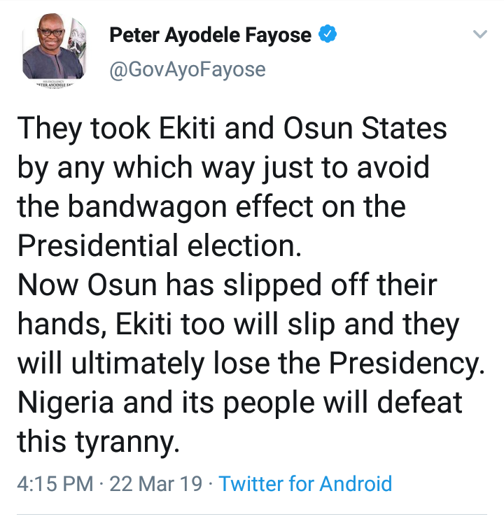 Now Osun has slipped off their hands, Ekiti too will slip and they will ultimately lose the Presidency.