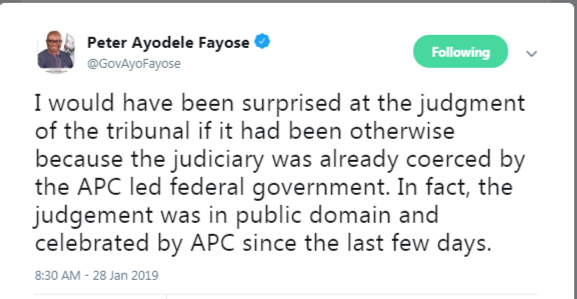Fayose on the Twitter verified handle react on the victory of Fayemi: