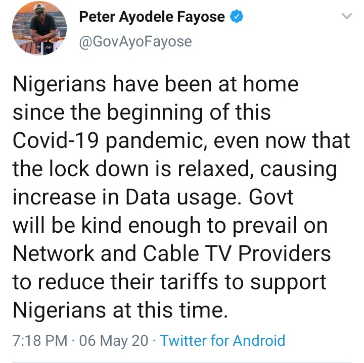 Former Governor of Ekiti State, Gov. Peter Ayodele Fayose has called on service providers to help Nigerians by reducing their Tariffs.