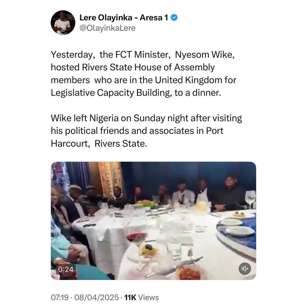 The former governor of Rivers State and current FCT Minister, Nyesom Wike, has reportedly held a meeting with the suspended members of the Rivers State lawmakers in the UK, amid the suspension of the Assembly and growing calls for a state of emergency in the state.