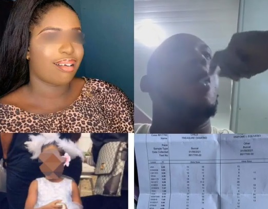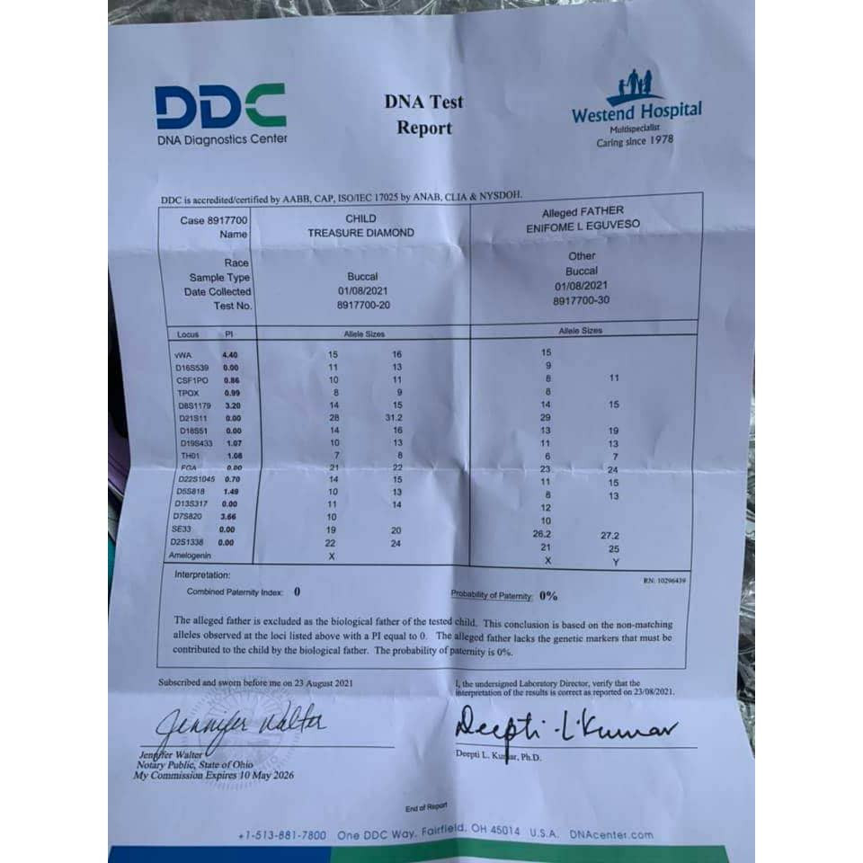Enifome began to have some doubts and decided to carry out a DNA test on the little girl. He said their samples were taken and sent over to the US for examination, The result returned today and it showed he is not the father of the little girl.