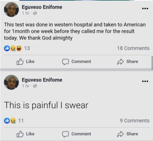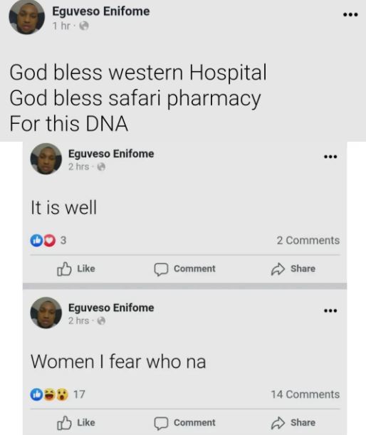 A disappointed Enifome in a series of posts shared on his Facebook page said he reached out to a young lady who according to him, he always had sex with while in school, to congratulate her on the birth of her child. He said it was when he reached out to her to congratulate her that she told him that the baby girl was his. He said when the matter got to his parents, they told him the baby girl looked like him and he accepted the child and began to play his role as her dad.