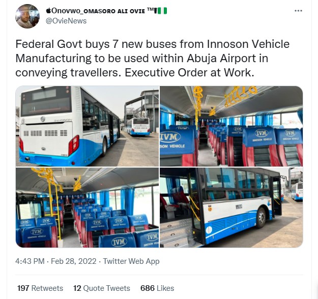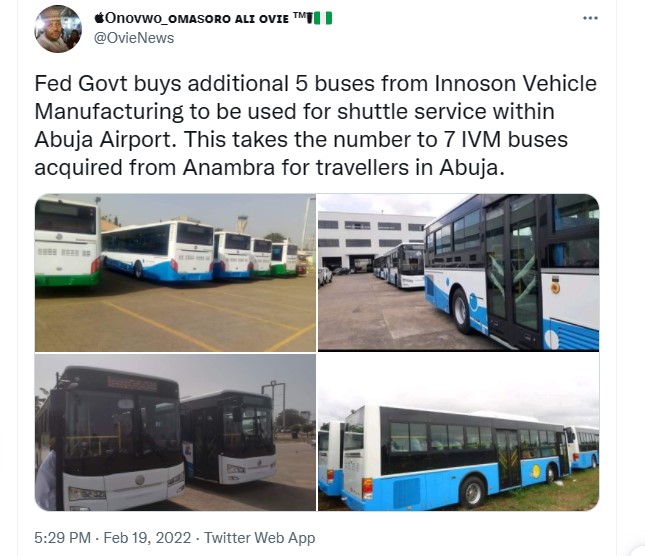 Federal Govt buys 7 new buses from Innoson Vehicle Manufacturing to be used within Abuja Airport in conveying travellers. Executive Order at Work.