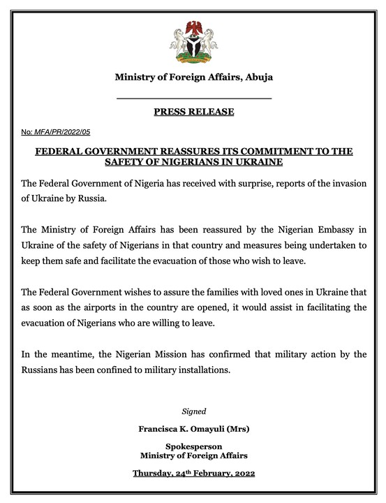 The Federal Government of Nigeria has received with surprise, reports of the invasion of Ukraine by Russia.