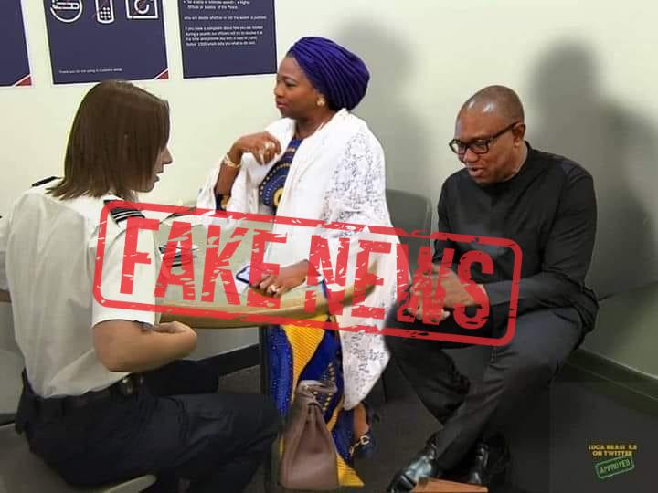 A fake photo has gone viral on the social media on Thursday purportedly showing the executive chairman of the Nigerians in Diaspora Commission (NiDCOM), Hon. Abike Dabiri-Erewa, seated in an office with Obi and a UK law enforcement officer in order to secure the LP presidential candidate’s release from detention.