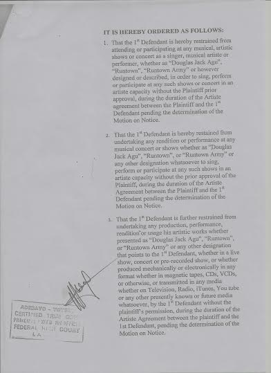 A Federal High Court sitting in Lagos has slammed an injunction against the rising musical artiste Douglas Jack-Agu aka “Runtown”. The injunction prevents him from performing at any event or any form of recording for the time being unless with the approval of Ericmany Limited. Runtown is signed under the Ericmany Entertainment label that presently holds the copyright to all his music.