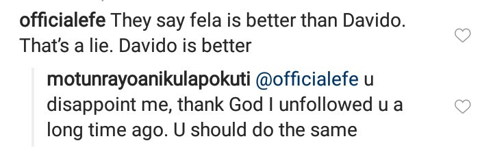 Efe Kpokpogri, a web user said “Davido is better” than Fela. This angered Motunrayo and she made her feelings known.