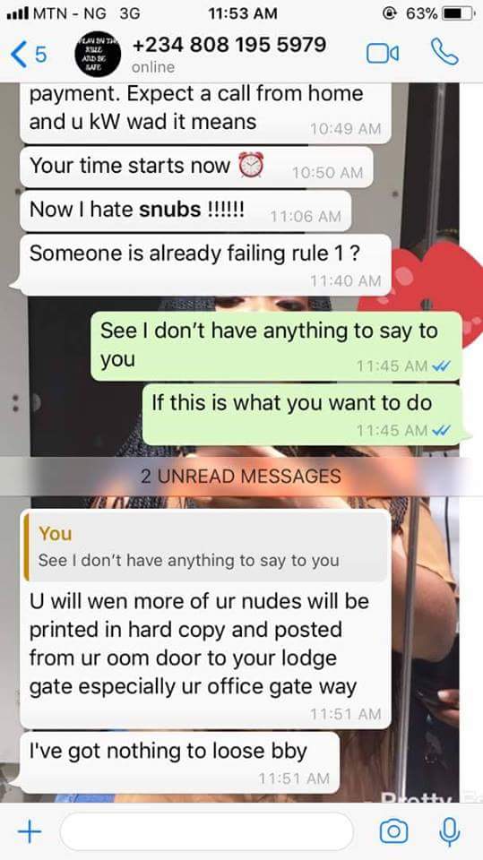 A young female corper is being blackmailed and threatened to pay N150,000 or have her nudes posted on various blogs, Instagram, Facebook and copies sent to her father and siblings.