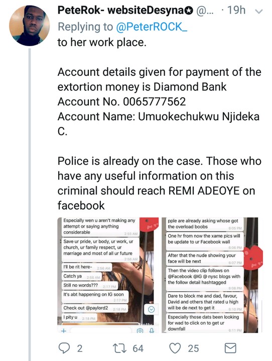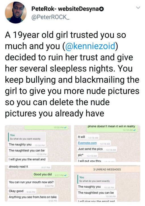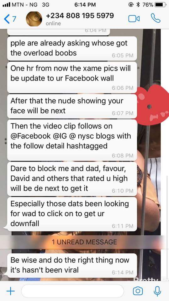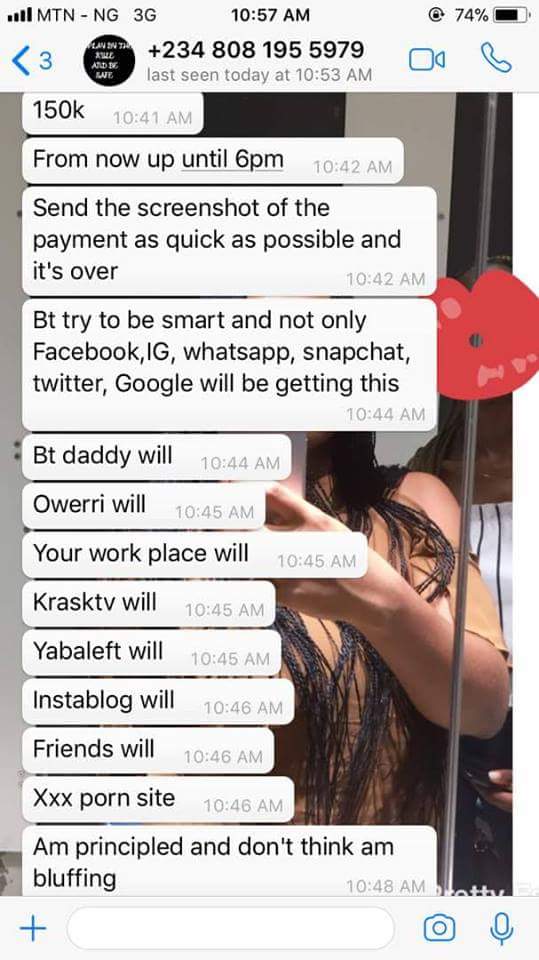 A young female corper is being blackmailed and threatened to pay N150,000 or have her nudes posted on various blogs, Instagram, Facebook and copies sent to her father and siblings.