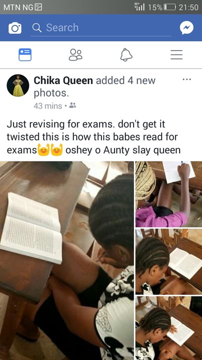 On her Facebook page she simply says they were only revising for exams by writing down ‘reminders’ on their laps. She is in one of the Universities currently taking exams. Na wa o!