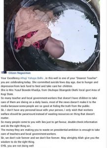 “Your Excellency Alhaji Yahaya Bello, in this well is one of your “Dearest Teacher” you are celebrating today. She committed suicide fews day ago, due to hunger and depression from lack fund to feed and take care her children,” he wrote.