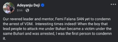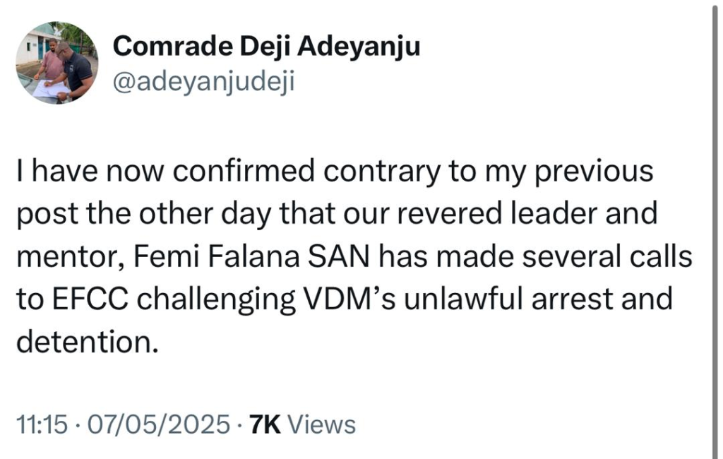 In a post shared on his X handle this afternoon, Adeyanju said he has now been able to confirm that Falana has indeed made calls to EFCC to challenge VDM’s arrest.