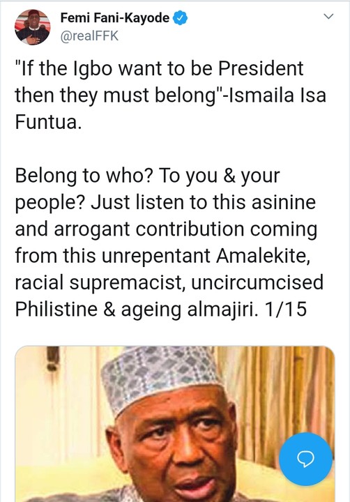 The former Aviation Minister and diehard human rights activist, Femi Fani Kayode has attacked Ismaila Isa Funtua for saying that if Igbo (Southeastern Nigeria) must occupy the position of President in 2023 general elections, “they should belong.”