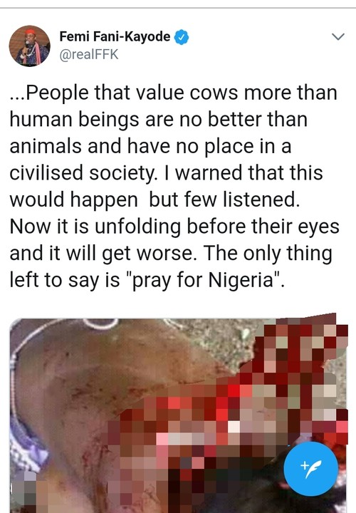 ..People that value cows more than human beings are no better than animals and have no place in a civilised society. I warned that this would happen but few listened. Now it is unfolding before their eyes and it will get worse. The only thing left to say is “pray for Nigeria”.