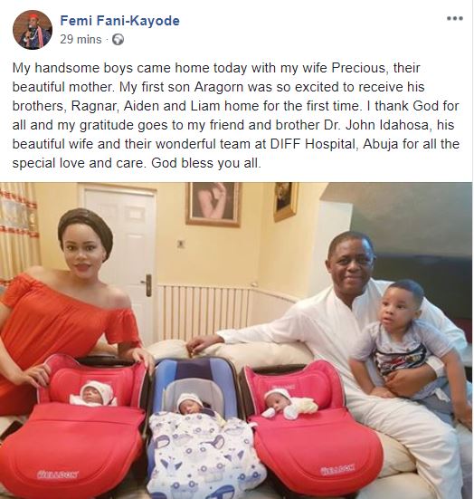 Femi Fani-Kayode has taken to Facebook to share adorable photo of his family including his triplets after they returned from the hospital.