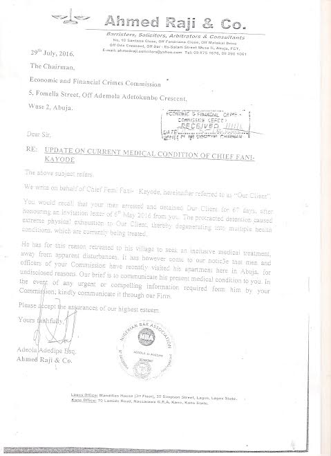 We made known our fears that Fani-Kayode’s life was in dire danger as long as he remained in EFCC custody or in the custody of any agency of the federal government based on discreet information available to us. This is apart from the fact that his health has been badly affected since his incarceration for a whopping 67 days based on some questionable ‘detention orders’. This fact is well known to the EFCC as Fani-Kayode’s lawyers have written several letters to the Commission reminding them of the health conditions of the former minister of aviation (Kindly see attached).