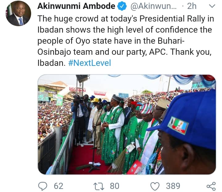 “The huge crowd at today’s Presidential Rally in Ibadan shows the high level of confidence the people of Oyo state have in the Buhari-Osinbajo team and our party, APC. Thank you, Ibadan. #NextLevel”