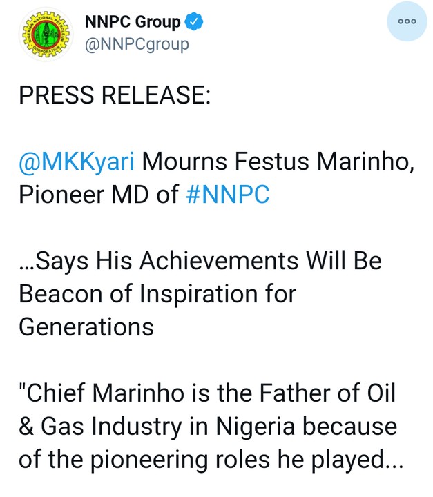 Chief Dr Sir Festus Marinho has died at the age of 87. He served as the managing director of the NNPC from 1977 to 1979 and also served a second term from 1984 to 1985.
