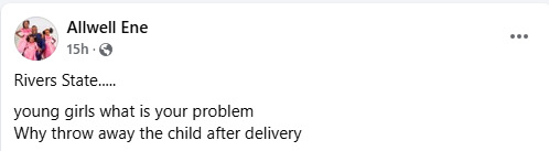 “Rivers State..…young girls what is your problem. Why throw away the child after delivery,” he wrote.