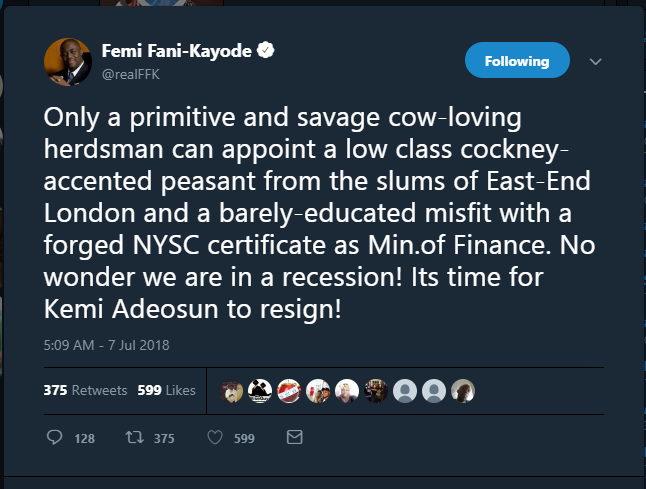 Only a primitive and savage cow-loving herdsman can appoint a low class cockney-accented peasant from the slums of East-End London and a barely-educated misfit with a forged NYSC certificate as Min.of Finance. No wonder we are in a recession! Its time for Kemi Adeosun to resign!