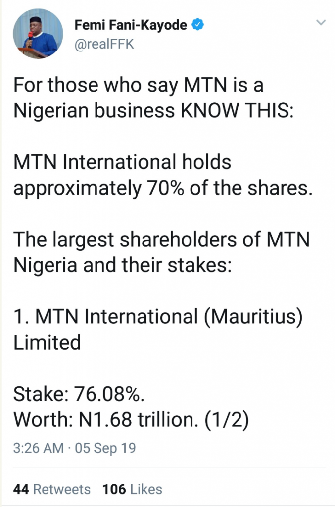 Former minister of aviation, Femi Fani-Kayode, FFK, has released a list to prove that MTN is not a Nigerian business.
