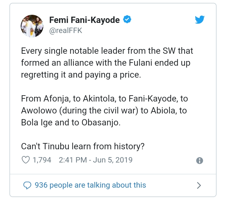 Former Aviation Minister, Chief Femi Fani-Kayode has warned National Leader of APC, Asiwaju Bola Tinubu against forming any form of alliance with Fulani leaders, saying that all notable Yoruba leaders that aligned with Fulani leaders in the past regretted their actions.