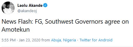 “News Flash: FG, Southwest Governors agree on Amotekun,” he tweeted.