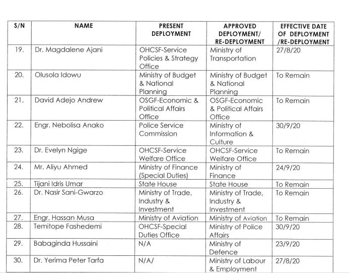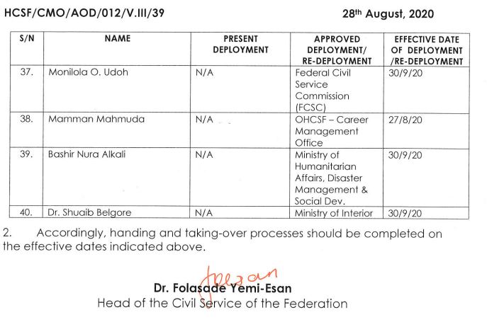 The circular conveying the redeployment and deployment was signed by the Head of the Civil Service of the Federation, Dr Folasade Yemi-Esan.