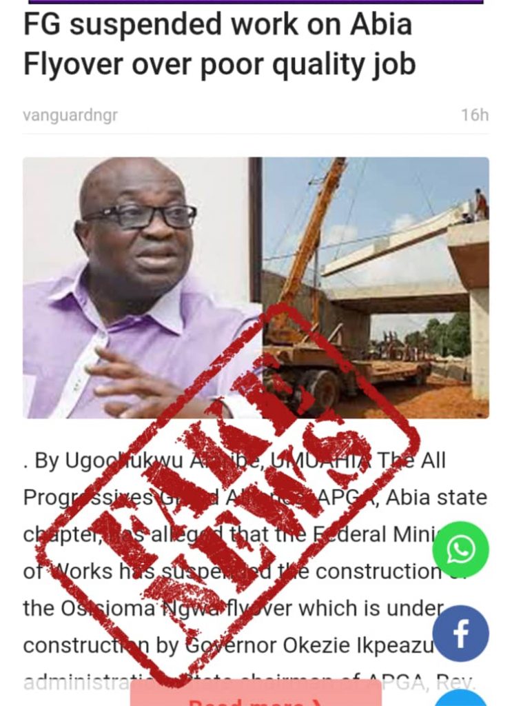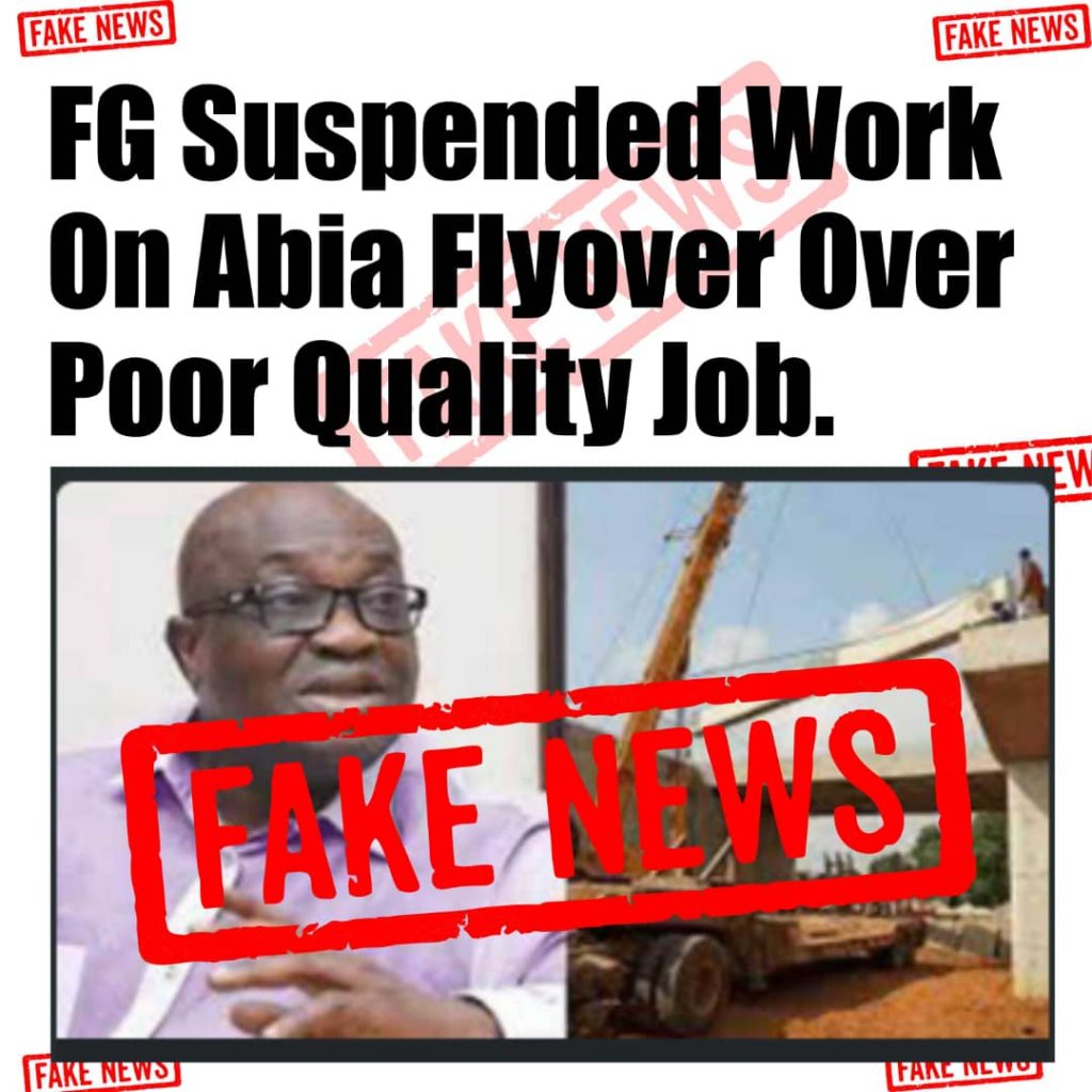 Abia State government has said the federal government did not at any suspend work at the lingering Osisioma Flyover, dismissing online media reports as fake news.
