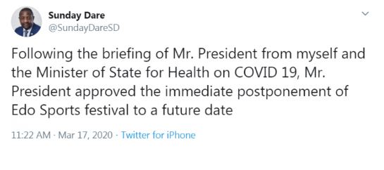 The Minister of Sports, Sunday Dare, in a series of tweets on Tuesday, said the postponement was to safeguard the spread of the virus in the country.