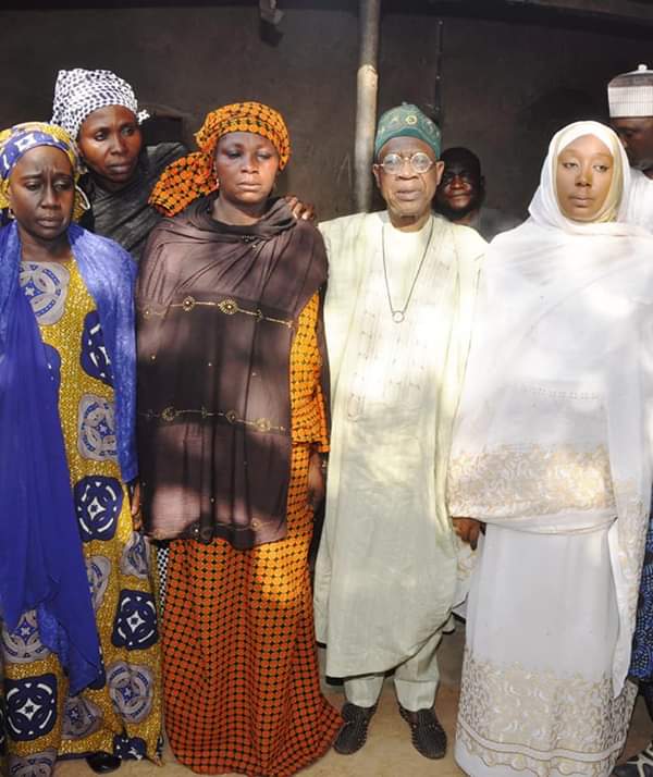 and Culture, Alhaji Lai Mohammed; Minister of State for Foreign Affairs, Hajia Khadija Abba Ibrahim when a Federal Government delegation visited Mrs. Sharibu, mother of the one of the abducted Dapchi school girls still in captivity in Dapchi, Yobe State, on Friday.