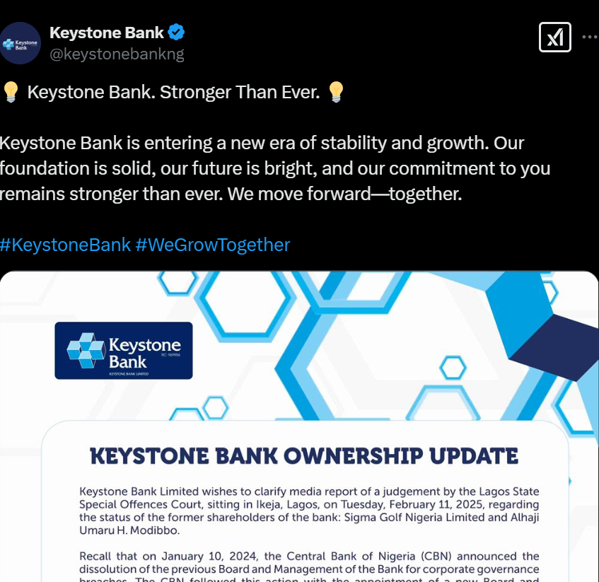 Keystone Bank confirmed this development in a statement posted on its X handle on Tuesday evening, stating, “Keystone Bank Limited wishes to clarify media reports of a judgment by the Lagos State Special Offences Court, sitting in Ikeja, Lagos, on Tuesday, February 11, 2025, regarding the status of the former shareholders of the bank: Sigma Golf Nigeria Limited and Alhaji Umaru H. Modibbo.”
