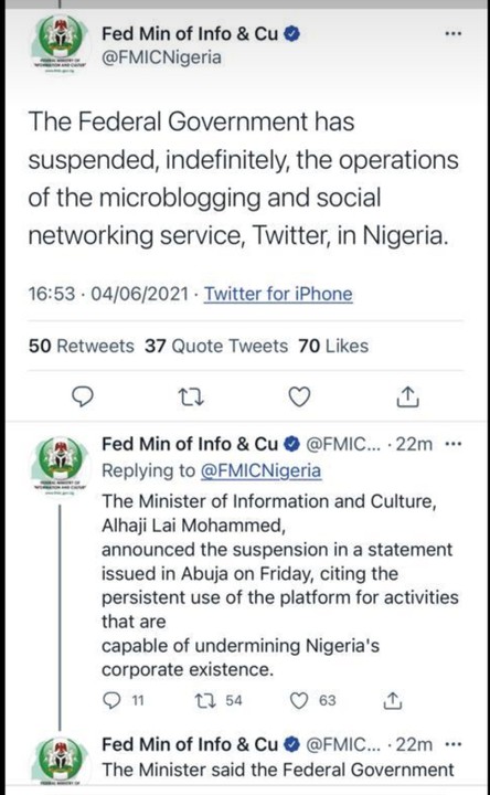 FG Used Twitter To Announce Suspension Of Twitter Operations In Nigeria