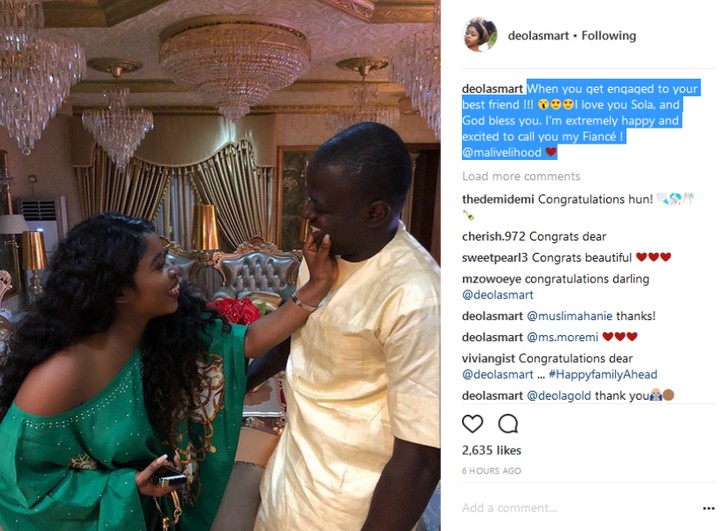 “When you get engaged to your best friend !!! ���I love you Sola, and God bless you. I’m extremely happy and excited to call you my Fiancé ! @malivelihood❤”
