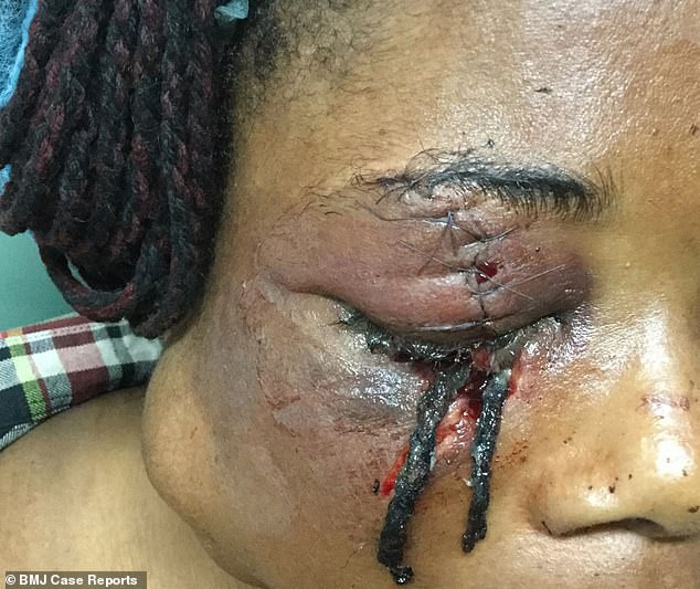 ‘The cause of the retention of the woven artificial hair on the face was not initially clear,’ Dr Etetafia wrote.