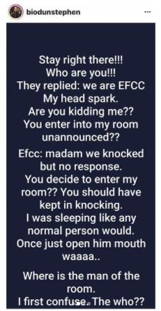 According to her, EFCC operatives broke into her hotel room around 3 am without her knowledge to arrest and search it.