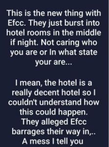 Biodun revealed that is how the EFCC operatives have been going about their illegal arrest and invasion of rooms at different hotels.