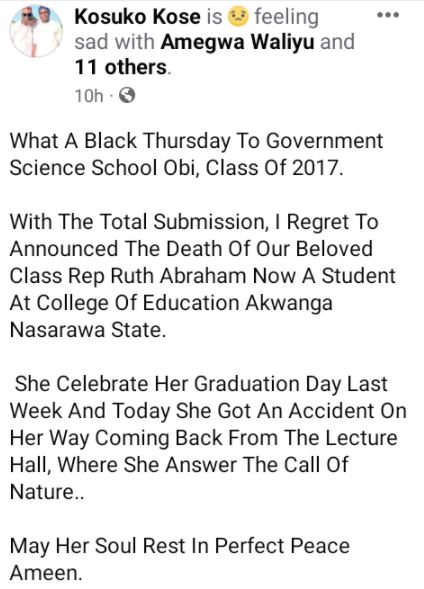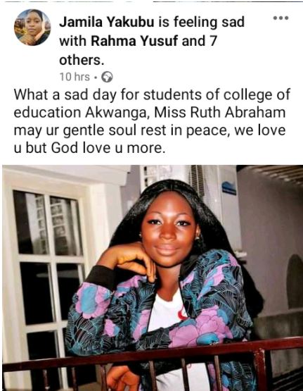 In what will come across as a really heartbreaking development, a final year student of the Department of Economics/Geography, College of Education (COE) Akwanga, Nasarawa State, Ruth Abraham, has died.