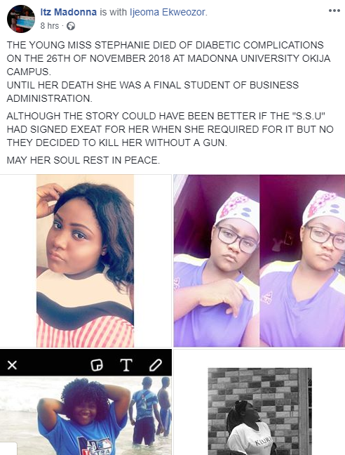 Friends who took to Facebook to mourn her claim she died of diabetic complications and they blame the school’s S.S.U for not signing an exeat form to allow her travel home for better treatment.