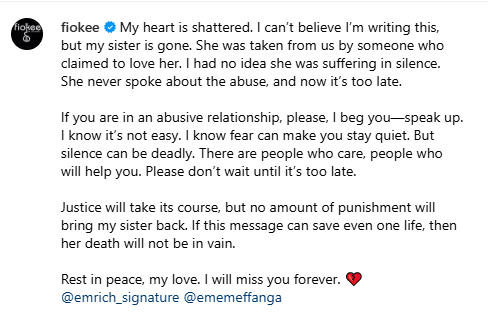 “My heart is shattered. I can’t believe I’m writing this, but my sister is gone. She was taken from us by someone who claimed to love her. I had no idea she was suffering in silence. She never spoke about the abuse, and now it’s too late,” he wrote.