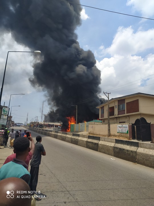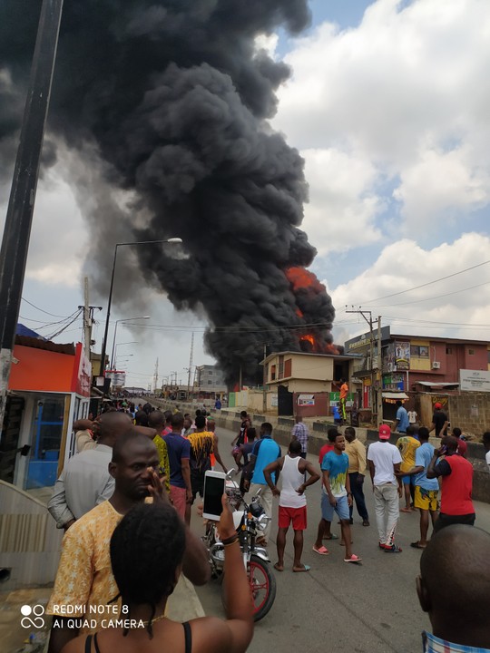 In photos shared online, Nigerians could be see recording the scene as fire rages from a building.
