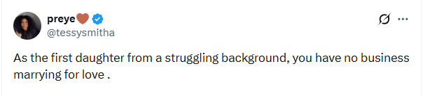 “First daughters from struggling homes support siblings, parents, and extended family. Marrying without considering stability affects more than just them. Moreover marrying for love is often a privilege for people who already have support system.