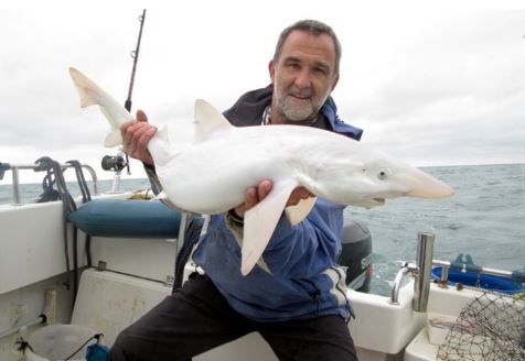 The man who caught the fish, identified as Jason Gillespie, 50, was delighted to discover he had hooked one of the first ever albino all-white sharks caught off the coast of Britain.