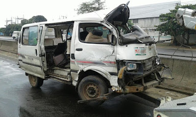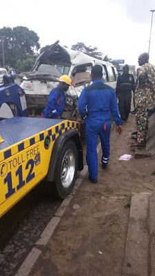 On getting to the scene of the accident, It was gathered that the container while on high speed developed a mechanical fault(Propeller) swarved to the next lane into a moving 18 passenger Toyota Hiace commercial bus with registration number Lagos MUS 684XC.