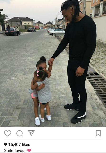 Flavour shared this cute photo via IG of himself and his two daughters from ex-beauty queens Sandra Okagbue and Anna Ebiere, hugging one another. He captioned the photo with a heart emoji on his page.