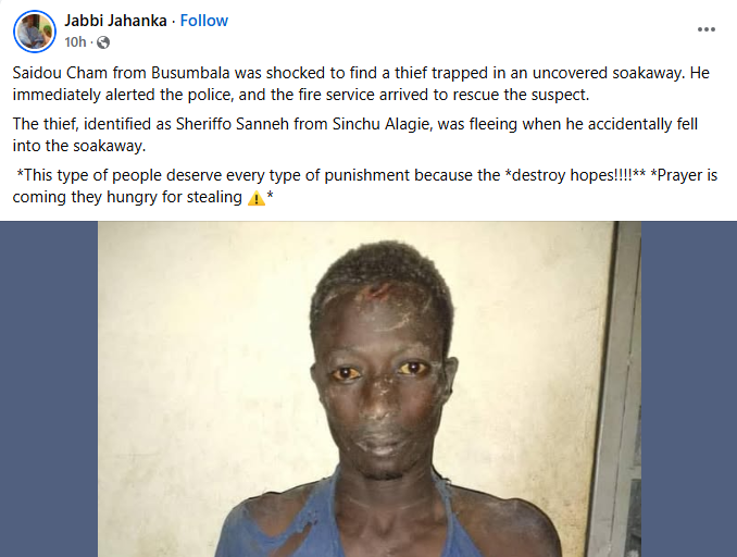 According to reports, one Saidou Cham from Busumbala was shocked to find the thief trapped in an uncovered soakaway.